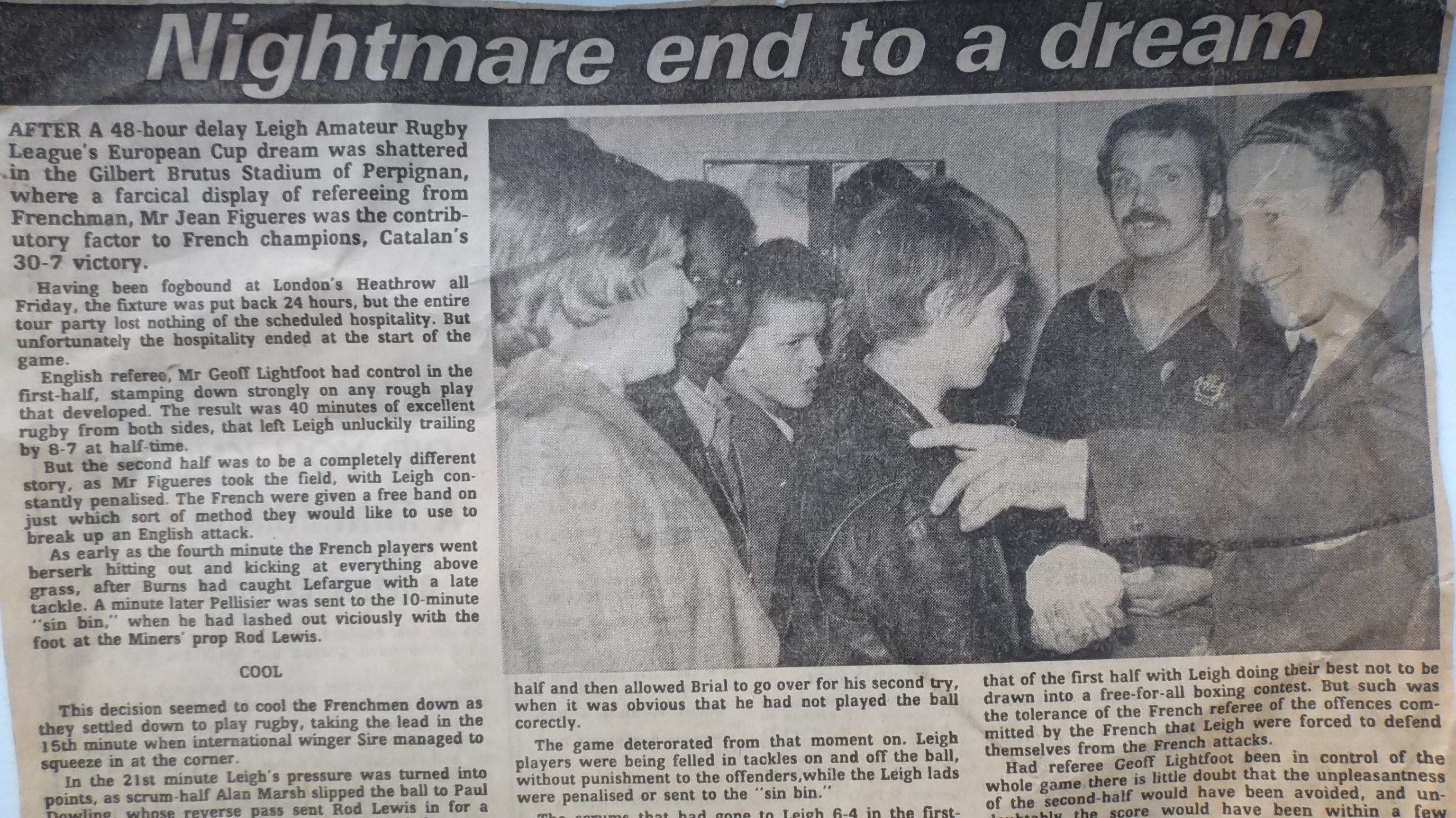 The French mistook us for Leigh. Perhaps one of the strangest matches Miners – or at least the club representatives in the 1978 Leigh League side – have ever been involved in was the short-lived European Cup which saw the Leigh side, as inter-league champions of the previous season, fly into the deep south of France in October 1978 to face XIII Catalans. The French side, the forerunners of the present-day Super League side Catalans Dragons, had claimed the Championnat de France the previous season by beating Roanne, and whether they believed they were playing Leigh’s professional team – as urban myth maintains – rather than the pick of the town’s amateur players or not, the Catalans certainly pulled out all the stops to ensure they would come out on top. It was a testing experience all round for the Leigh side, captained by Paul Dowling, who were held up at London Heathrow for 24 hours owing to fog, before flying out to Perpignan to face their hosts at the Stade Gilbert Brutus. As part of the unique flavour of the match the first half would be refereed by Geoff Lightfoot, who had traveled with the tour party, before local official Jean Figueres took the whistle for the second half, an arrangement which would prove crucial in the final reckoning and disastrous for the Leigh side.
